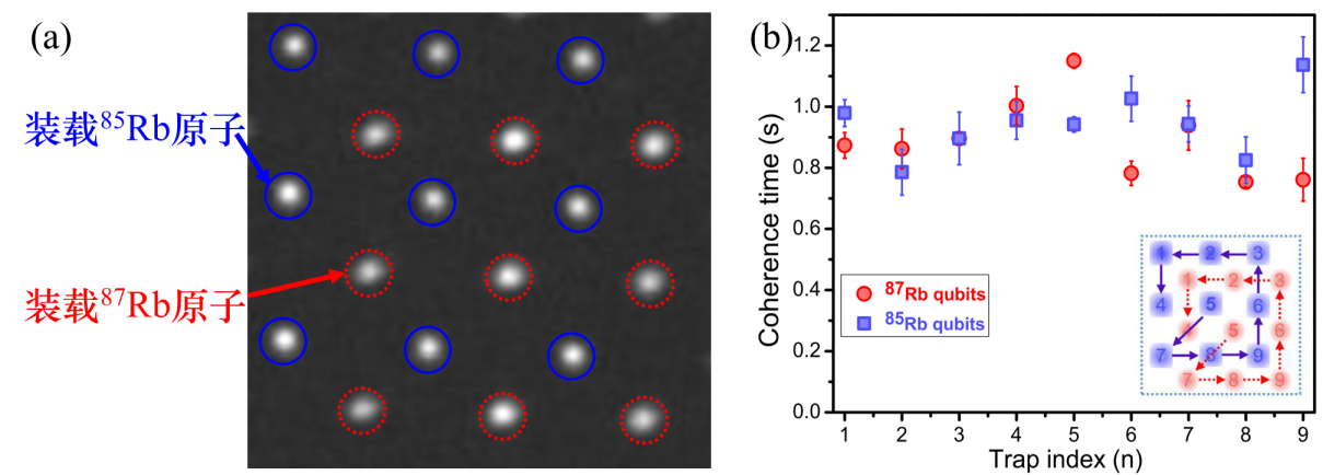 (b)多量子比特阵列中,87Rb和85Rb原子内态平均相干时间分别为891±43 ms和943±35 ms。每种偶极阱阵列的格点标记为1到9,其中标记为5的格点用于校准魔幻光强阱阱深。以箭头表示测量相干时间的顺序。