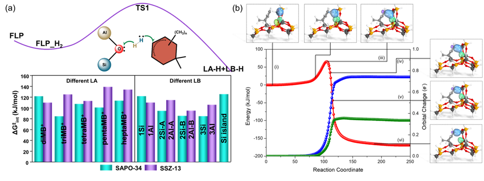 受阻的路易斯酸碱对(Frustrated Lewis Pairs, FLP)是均相催化反应中的重要概念,在FLP复合物中路易斯酸(LA)和路易斯碱(LB)的直接结合被位阻效应抑制,从而使得LA和LB能够分别作为电子对受体和给体活化小分子。近年来,这一概念逐渐被引入到多相催化体系以解释金属氧化物表面缺陷和掺杂位点的高催化反应活性。鉴于此,EVO视讯官网郑安民研究团队和大连化学物理研究所研究员魏迎旭、博士韩晶峰合作,进一步将FLP概念拓展到分子筛催化体系,并探究了其对于氢气和烷烃活化的能力。