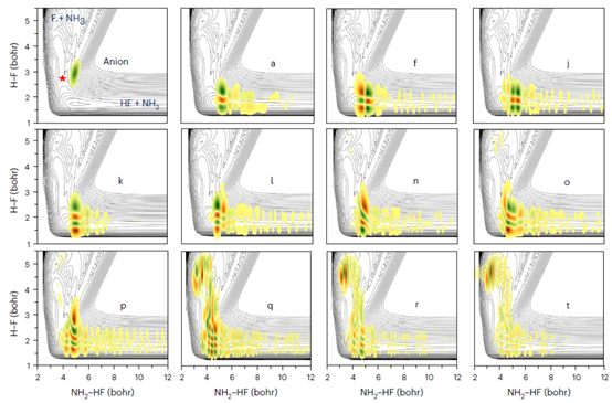 该工作结合慢光电子速度成像光谱实验和量子动力学理论,观测到多原子分子反应 F + NH3 → HF + NH2 过渡态区域的多个振动Feshbach共振峰(图1)。共振波函数表明这些Feshbach共振态位于产物端势阱、过渡态和反应物端势阱等区域(图2),成因于单个或多个反应体系振动模式的激发。由于部分Feshbach共振态的能量高于反应物势能,因而可能影响化学反应的速率和量子态分布。本研究取得了多原子分子反应过渡态现在最完整的图像,表明过渡态光谱方法已经具备探究多原子分子反应过渡态区域复杂动力学行为的能力。