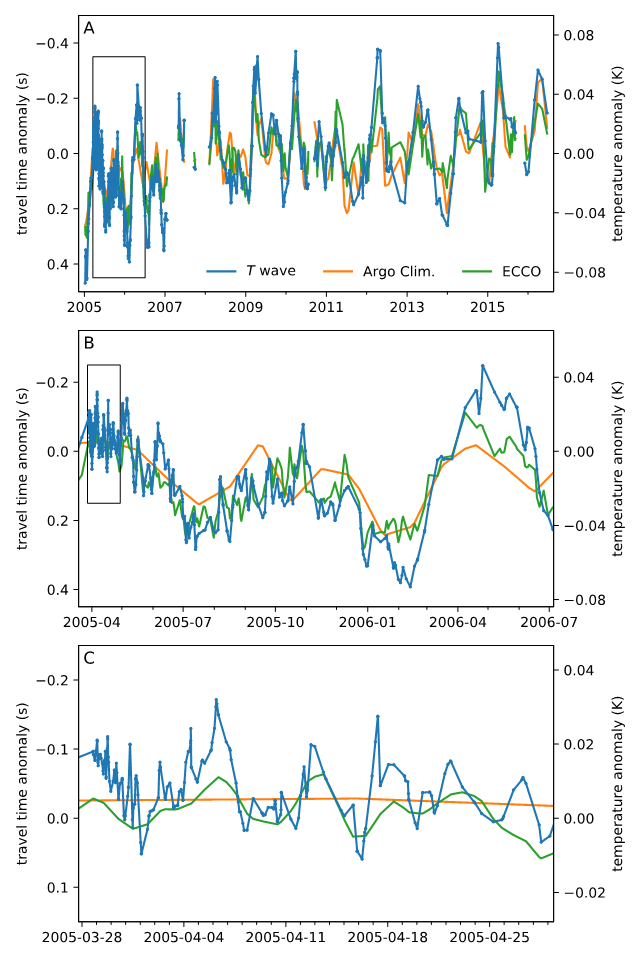 气候变化是公众及学者高度关注的问题。大气中二氧化碳等温室气体浓度的上升,导致了气候系统中热量增加(excess energy),而海洋吸收了其中90%以上的热量,因此海洋在气候变化中起到关键的作用。然而,深层海水温度实测资料严重不足,人们对于海洋深处的温度变化特征分析十分有限,这制约了科学家对长期气候变化的深入认识。针对此难题,美国加州理工学院地震学实验室博士吴文波、助理教授詹中文以及EVO视讯官网大地测量与地球动力学国家重点实验室研究员倪四道三位地震学者提出了利用地震T波测量深海温度变化的新方法,在与物理海洋学家合作的基础上,取得了2005-2016年期间的赤道东印度洋深层海水温度多时间尺度的变化特征。该方法为物理海洋学及气候变化研究给予了新手段。相关研究发表在国际学术期刊《科学》(Science)上。
