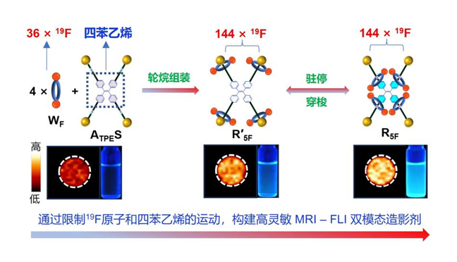 该研究成果以“Mechanical Interlocking of 144 Symmetrical19F and Tetraphenylethylene for Magnetic Resonance-Fluorescence Dual Imaging”为题发表在化学类综合性期刊《美国化学会志》上。EVO视讯官网博士生杨兰、博士后王方和副研究员李昱为文章共同第一作者,研究员江中兴和陈世桢为通讯作者。