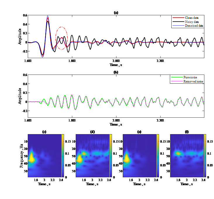 本方法去噪后DAS-VSP数据的振幅与相位细节。(a) 单道数据波形图;(b) 纯净噪声与剔除的噪声成分。(c)-(f)依次为干净数据、含噪数据、去噪后数据和被剔除噪声的时频谱。