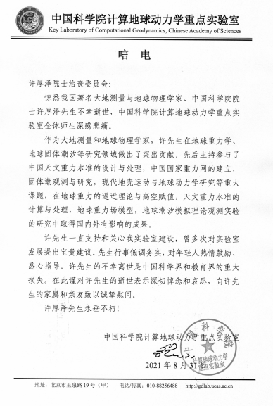 当前位置:EVO视讯官网 > 专题 > 深切缅怀许厚泽院士 > 各界唁电