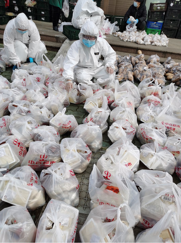 从筛选商家和统计小区居民需求,到整理分发物资,每天早上7点就开始接打电话,统计。匆匆吃完早餐,她又独自一人开车到附近的中百超市,早早的排队购买猪肉、鸡蛋、蔬菜等物质。有人要瘦肉,有人要五花,有人要排骨,分量多、样式多,各种需求她都用小本本一一详细记录。每次都早早的在肉类柜台等候,有时候去的太早,处理肉品的师傅还在将一整块猪肉切割分类,她就守在旁边,在超市封闭的空间里,戴着厚重,在正常环境都呼吸有阻的口罩和防护服一等一个小时。有时候超市的份额不够,她一天要跑好几趟。每份物质都重达5斤以上,她本就身材娇小,初期的采购,从购买、分类、装车、卸货、分发,她都独自完成,每次分发,要在社区里忙碌近9个小时。从下午1点不断忙到晚上9点多。因为怕人多聚众会有传染的风险,于是她按照时间段,有条不紊的通知大家陆续取货,还不忘嘱咐大家保持合理的安全距离。因为身穿防护服受限,在这期间,她没时间吃饭,不敢去洗手间,不敢离开发放场地,就怕有人来了找不到人领取。“他们在外面待的时间越长越危险,所以得最高效的让大家领到东西,同时安安全全的回家才行,真的很担心有人因为领取物资被感染了”。 每次回到家,都浑身湿透,饥肠辘辘,她时刻关心他人的风险,而自己却在最危险的一线从早到晚,无怨无悔。