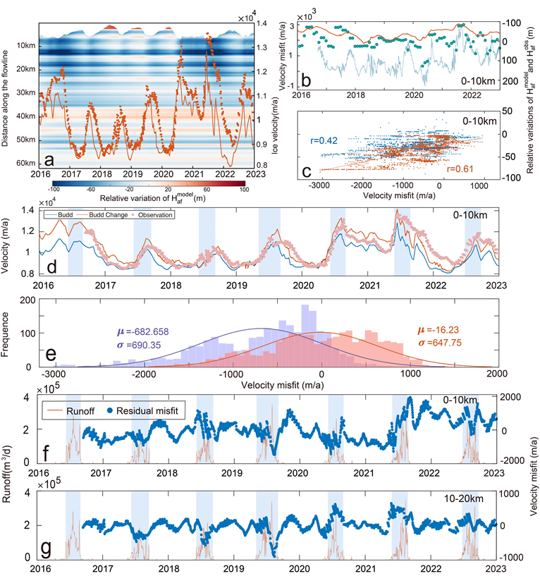 研究发现,当以观测的亚月度冰川末端位置作为强迫条件时,模型可再现约76%的流速变化。在冰川末端0-10公里范围内,模型化与观测流速的误差与“浮力以上高度”(Haf)的变化显著相关。Haf作为有效压力变化的代理变量,纳入模型后可解释冰川末端0-10公里范围内90%以上的误差。模型考虑瞬态基底摩擦变化和冰厚引起的有效压力变化后,地表径流变化与流速残差误差的峰值一致,表明地表融化对冰流速的短期影响低于10%。研究表明,Jakobshavn Isbræ冰川的流速变化主要受末端位置变化的驱动,但冰厚变化和冰下水文过程引起的有效压力及基底条件的季节性变化也对其年际和季节性加速有显著影响。随着冰川向更深盆地退缩,其对季节性有效压力变化的敏感性将持续存在。该研究首次系统量化了末端退缩、冰厚变化及水文过程对格陵兰冰川动力学的影响,并强调了在数值模型中准确参数化冰下有效压力的重要性。研究成果将提升格陵兰冰盖未来演化的预测精度,为全球海平面上升评估给予更可靠的科学依据。