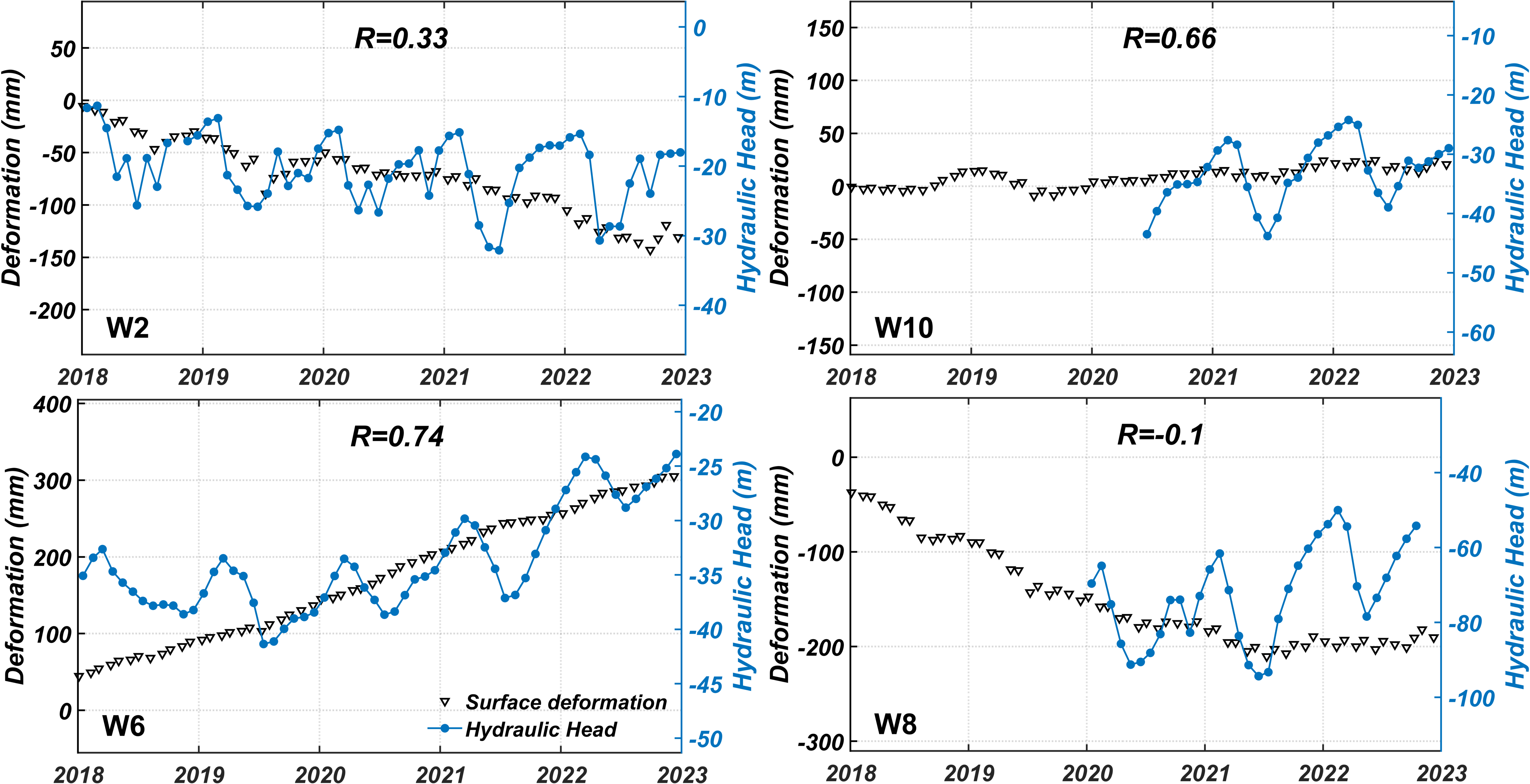 4个地下水位监测点附近的变形和水头的时间序列