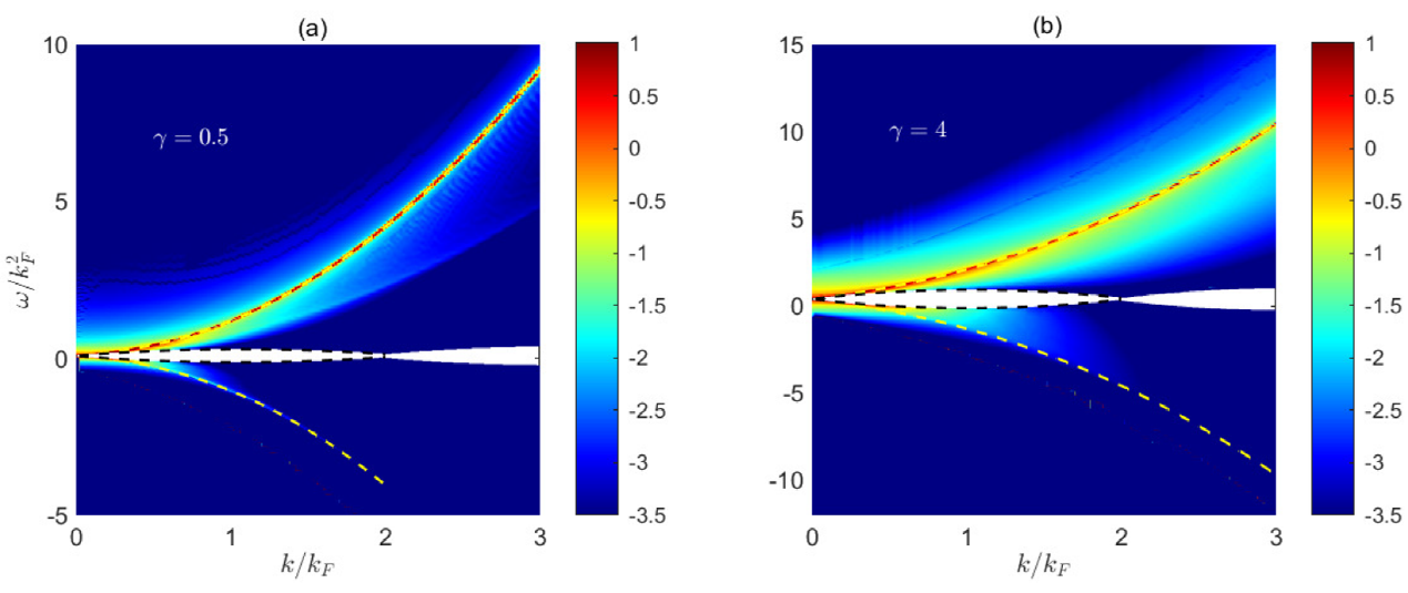 (a) 中等强度(γ=4.0)下, k=0.1kF的谱函数随能量变化的曲线。黑色虚线和点线分别标示了I型和II型激发谱的边界;(b) 谱函数在四个边界附近的幂律行为。红色和蓝色圆圈表示计算结果,黑色虚线代表拟合的幂律曲线。