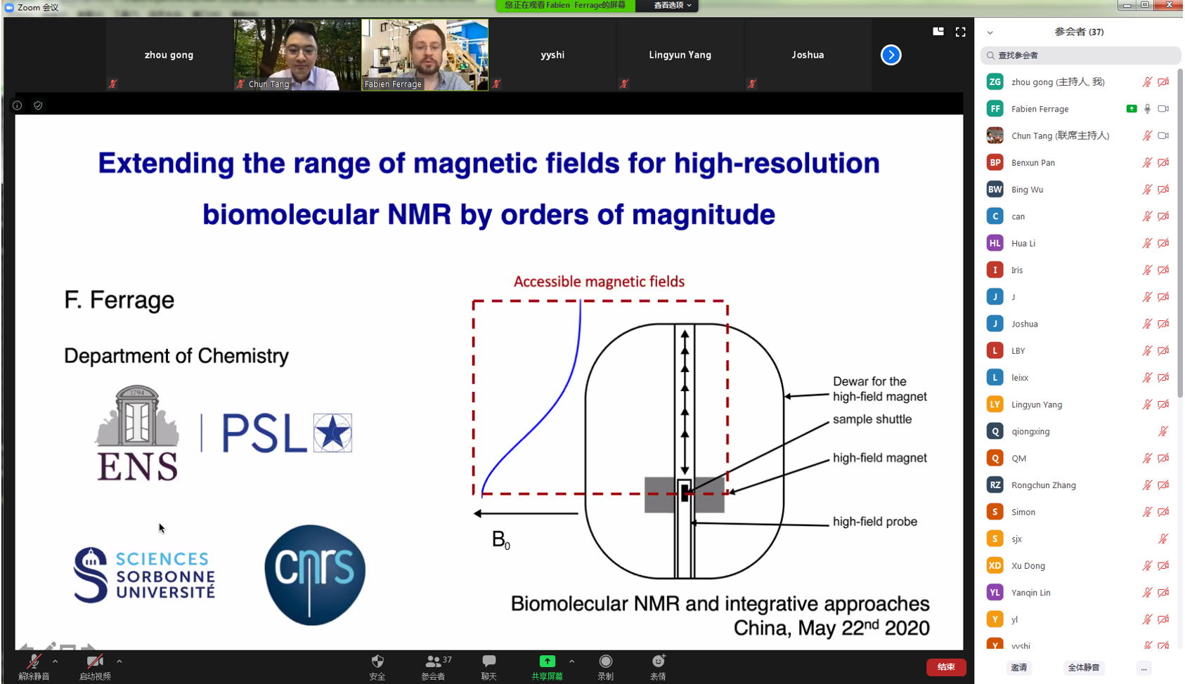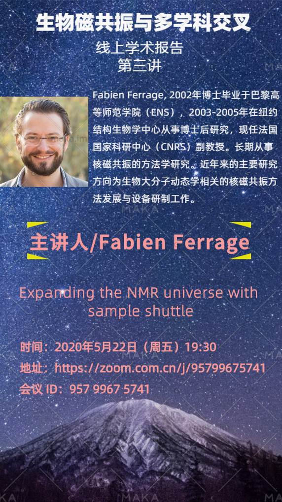 5月22日晚7:30,应EVO视讯官网唐淳研究员的邀请,法国国家科学研究中心(CNRS)Fabien Ferrage教授在线上平台做了题为“Expanding the NMR universe with sample shuttle”的学术报告。