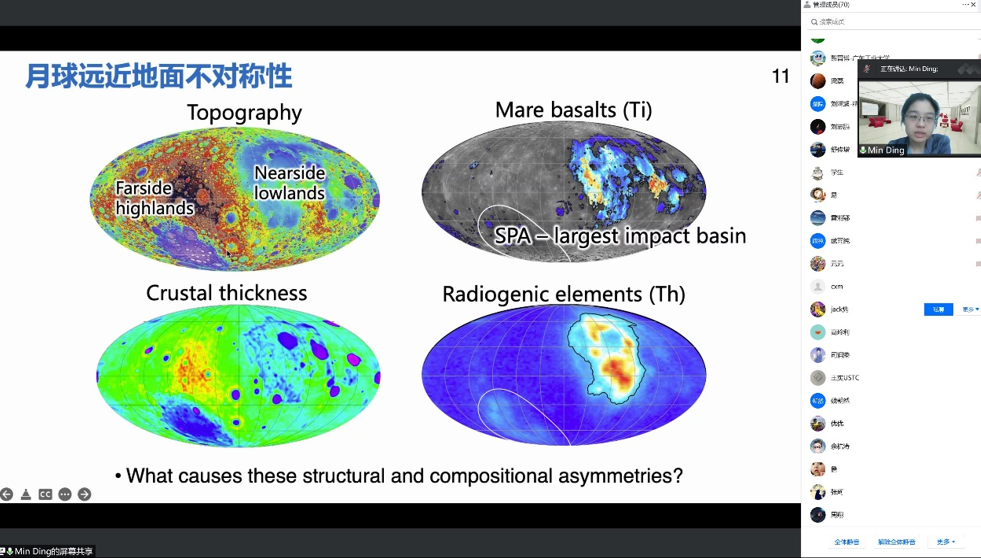 丁忞第一时间介绍到月球形成早期,活跃的内外动力学作用共同塑造了月球内部物理化学结构,并决定了其后续的地质演化过程。内外动力学作用并非相互独立,一方面撞击生热减缓月球冷却过程并影响月幔对流;另一方面热状态也影响着撞击成坑和撞后松弛过程。内外动力学相互作用也有助于解释月球远近地面的不对称性:月球最大的撞击事件(南极-艾特肯盆地撞击)可以顺利获得影响月幔倒转过程造成钛铁矿堆晶和放射性生热元素在近地面集中。放射性生热元素分布将影响热状态,而热状态的不对称性进一步影响后续撞击盆地的形成与演化,能够解释远近地面撞击盆地大小和结构的差异。最后就火星岩石圈结构的形成演化做了简要介绍。