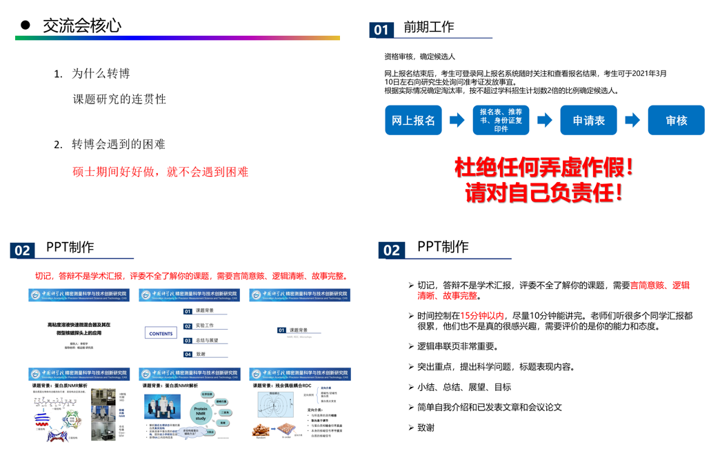 12月13日,中国科研实验室精密测量科学与技术创新研究院召开2019级研究生班会暨转博研讨会。本次活动顺利获得线上形式举行,由2019级班委承办,研究生处副处长蔡怡春及相关工作人员参加了活动。